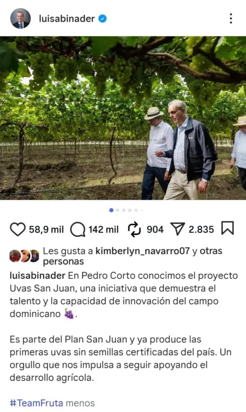 “En Pedro Corto conocimos el proyecto Uvas San Juan, una iniciativa que demuestra el talento y la capacidad de innovación del campo dominicano 🍇. Es parte del Plan San Juan y ya produce las primeras uvas sin semillas certificadas del país. Un orgullo que nos impulsa a seguir apoyando el desarrollo agrícola. #TeamFruta”, escribió Abinader.