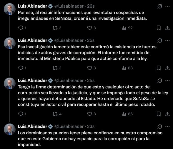 SANTO DOMINGO.– El presidente Luis Abinader dispuso que el Seguro Nacional de Salud (SeNaSa) se constituya en actor civil con el objetivo de recuperar hasta el último peso del patrimonio público que haya sido sustraído, tras confirmarse graves indicios de corrupción dentro de la institución.