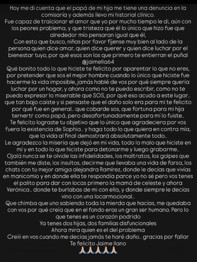 La maquillista profesional publicó el lunes en sus redes sociales imágenes en las que muestra heridas, indicando que se había cortado intentando rescatar a su hija, luego de descubrir que su expareja, Jaime Llano, presentó una denuncia adjuntando su historial clínico, alegando inestabilidad. También señaló que su familia lo estaría apoyando.
