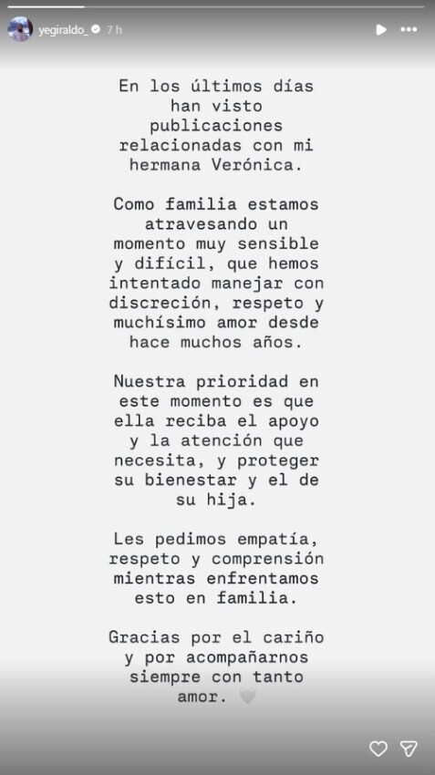 “En los últimos días han visto publicaciones relacionadas con mi hermana Verónica. Como familia estamos atravesando un momento muy sensible y difícil, que hemos intentado manejar con discreción, respeto y muchísimo amor desde hace muchos años. Nuestra prioridad en este momento es que ella reciba el apoyo y la atención que necesita, y proteger su bienestar y el de su hija. Les pedimos empatía, respeto y comprensión mientras enfrentamos esto en familia. Gracias por el cariño y por acompañarnos siempre con tanto amor”.