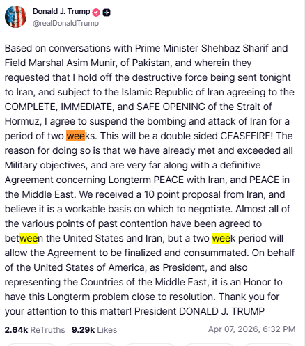 «La razón es que ya hemos cumplido y superado todos los objetivos militares y estamos muy avanzados en un acuerdo definitivo sobre la paz a largo plazo con Irán y la paz en Oriente Medio», publicó en su red social Truth Social.