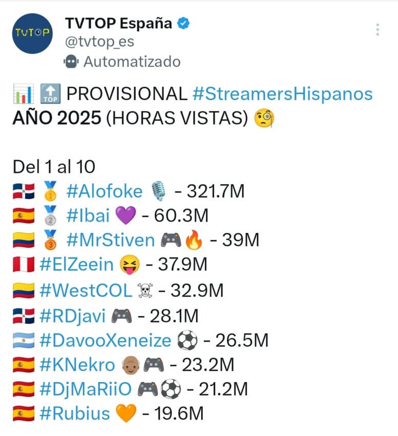 Santo Domingo.- El visionario empresario y productor de contenido dominicano, Santiago Matías «Alofoke», ha alcanzado una cumbre de la comunicación mundial al ser designado Streamer del Año 2025 y asegurar la posición número 1 en el ranking provisorio de Streamers Hispanos con mayor Media de Viewers (Media Viewers), según la influyente plataforma española TV TOP España.