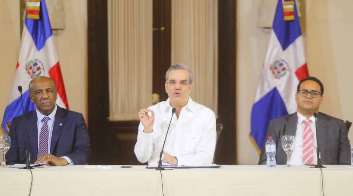 El presidente Luis Abinader junto al ministro de Energía y Minas, Antonio Almonte, y Andrés Astacio, vicepresidente del consejo unificado, durante la rueda de prensa.