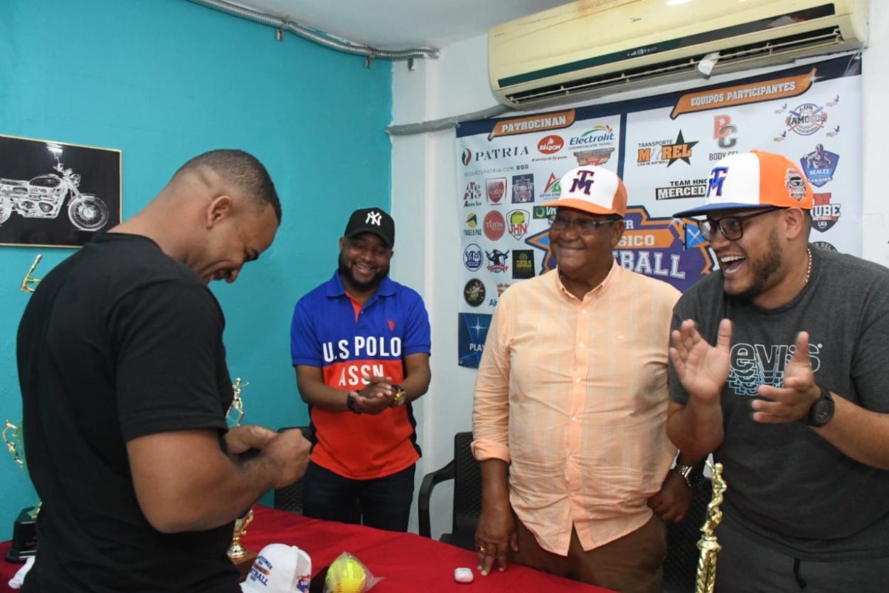 José Morel, segundo desde la derecha, auspiciador del Clásico Transporte Morel de softbol, durante el sorteo para agrupar los equipos en el torneo arranca el sábado 13 de agosto a las 2:00 de la tarde. (Fuente externa)