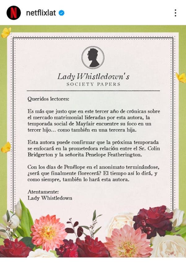 En tanto, ya Netflix también confirmó a los protagonistas de la próxima temporada, anunciando su foco en el tercer hijo de los Bridgerton y la tercera hija de los Featherington.