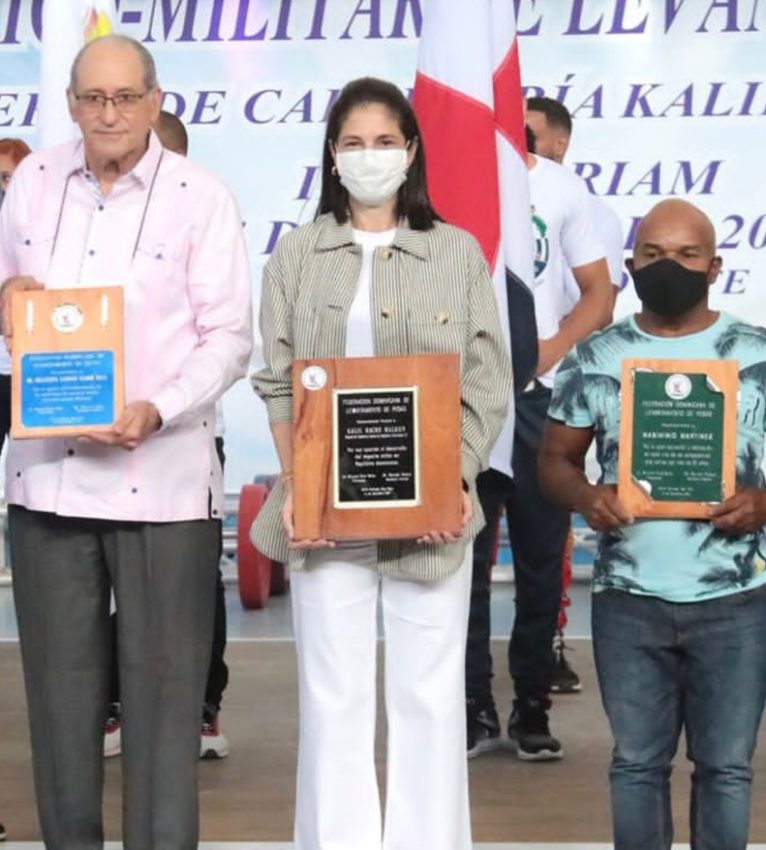 Desde la izquierda, el doctor Francisco Valdez Mena, Maribel Haché (hija de Kailil Haché) y Maximinio Martínez, reconocidos en la Copa Cívico-militar de Levantamiento de Pesas Kalil Haché.