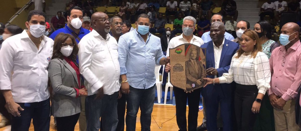 Lisandro Macarrulla, ministro de la Presidencia, recibe un reconocimiento de parte del alcalde de San Pedro de Macorís, Raymundo Ortiz, y el diputado Luis Gómez Benzo, presidentes del Comité Organizador. Les acompañan, Rafael Uribe, Carlos Robles, Alberto Rodríguez y Aracelis Villanueva, entre otras personalidades.