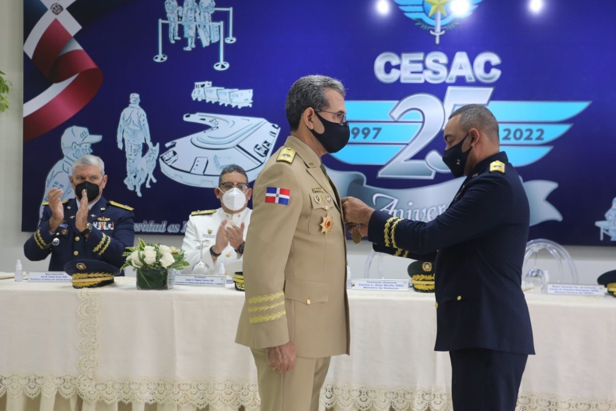 Santo Domingo.-El Cuerpo Especializado en Seguridad Aeroportuaria y de la Aviación Civil (CESAC) condecoró con la “Medalla al Mérito en Seguridad de la Aviación Civil” al Ministro de Defensa, Teniente General Carlos Luciano Díaz Morfa, ERD, en el marco de la celebración del 25 Aniversario de la institución.