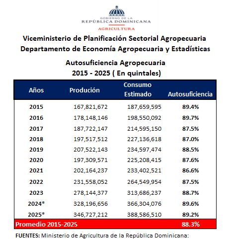 La autosuficiencia agropecuaria dominicana antes de la llegada del Covid en el país era de 88.5%, específicamente en 2019. En consecuencia, este indicador creció apenas 0.70 puntos porcentuales al cierre de 2025, que registró 89.2 %.