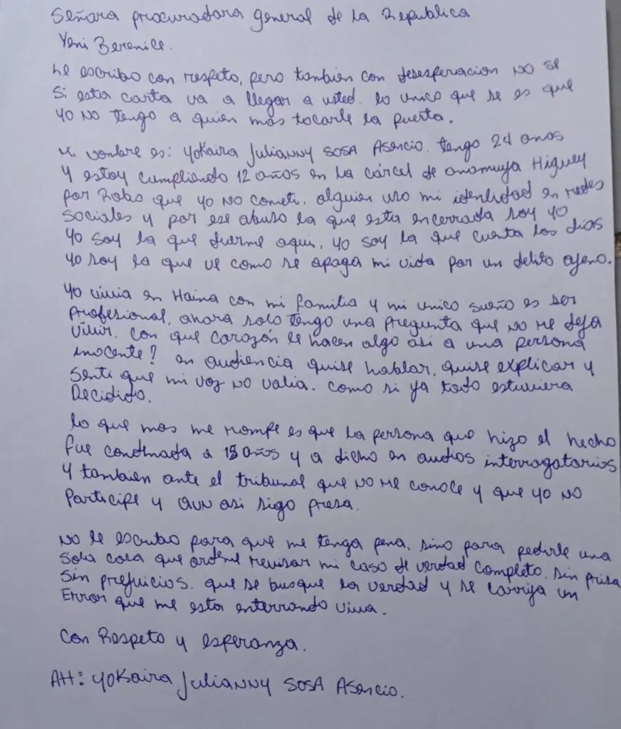 Santo Domingo.– “No pido lástima; pido que se busque la verdad” . Con esa frase, escrita a mano desde una celda del Centro de Corrección y Rehabilitación de Mujeres de Anamuya, en Higüey, Yokairy Julianny Sosa Asencio , de 24 años, solicitó la revisión de la condena de 12 años de prisión que cumple por un robo que asegura no haber cometido.