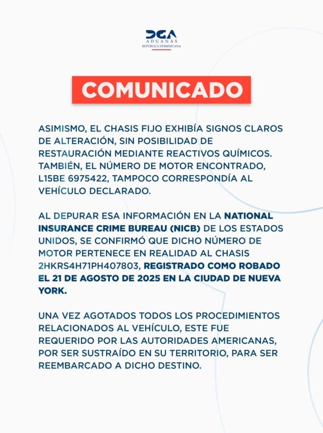 La DGA reiteró que este caso es resultado de los controles de inteligencia, cooperación interinstitucional y verificación técnica que se aplican a las importaciones, como parte de sus esfuerzos para combatir el tráfico de vehículos robados y proteger el comercio legal en el país.