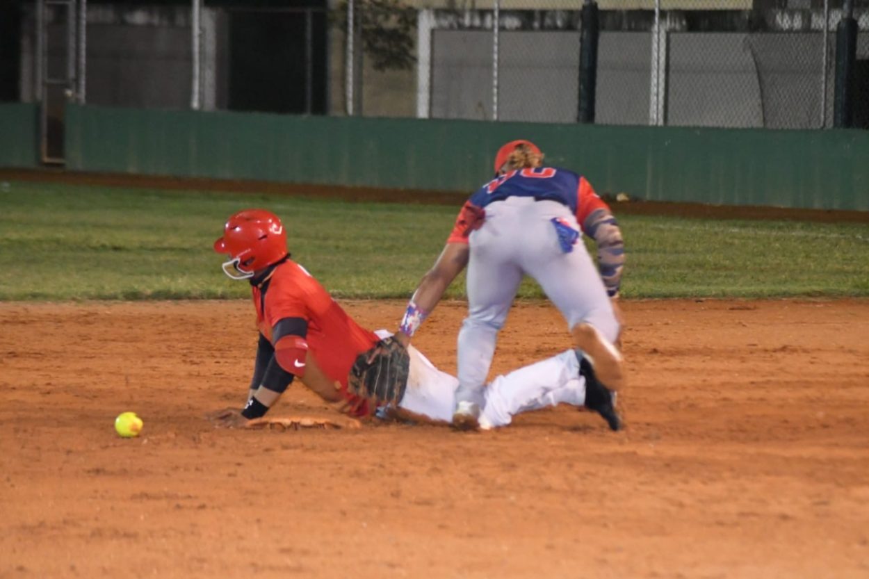 Johan Abreu de los Corderos/Alcarrizos llega “safe” a segunda base en el partido que su equipo venció a los Indios de Fe y avanzó a la final de Clásico Miguel Ceballos de Softbol. (Fuente externa)