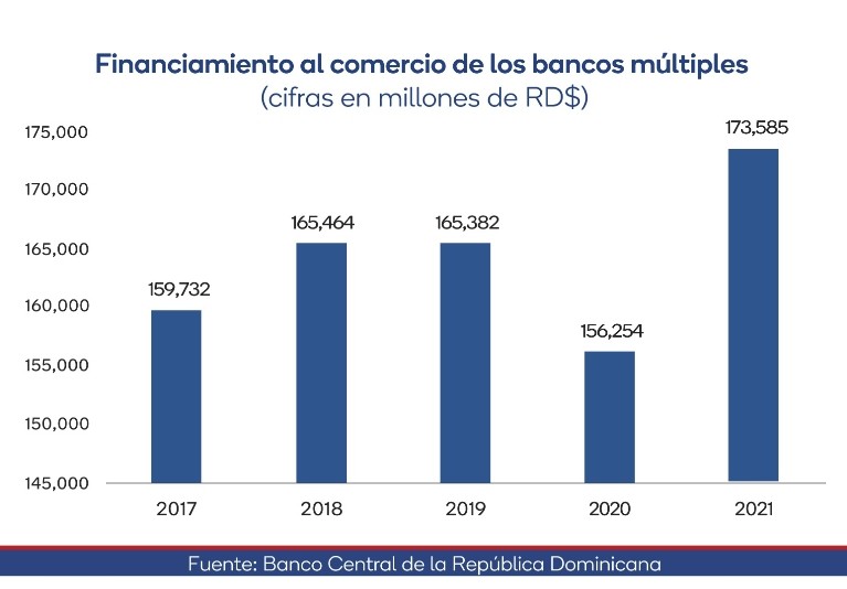 La Asociación de Bancos Múltiples de la República Dominicana (I ABA) informó este viernes que durante los últimos cinco años, la banca múltiple aumentó su financiamiento al comercio en RD$13,853 millones, al pasar de RD$159,732 millones en 2017 a RD$173,585 millones en 2021, mostrando un crecimiento acumulado de 8.67% en ese lustro.