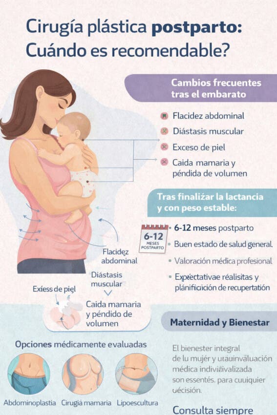 Desde el punto de vista clínico, el especialista indicó que la evaluación de una intervención quirúrgica suele recomendarse entre los seis y doce meses posteriores al parto, una vez finalizada la lactancia y cuando el peso corporal se mantiene relativamente estable.