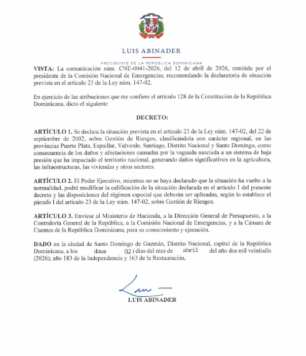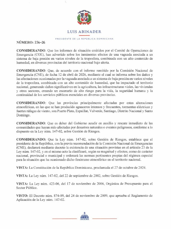 El Presidente Luís Abinader declaró estado de emergencia regional para cinco provincias y el Distrito Nacional como consecuencia de los daños y afectaciones causadas por la vaguada asociada a un sistema de baja presión que ha impactado el territorio nacional, generando daños significativos en la agricultura, las infraestructuras, viviendas y otros sectores.