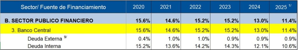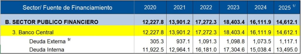 El saldo de la deuda del Banco Central pasó de US$16,111.9 millones en 2024 a US$14,612.1 millones en 2025, lo que indica una disminución del 9.31%, equivalente a una reducción absoluta de US$1,499.7 millones.