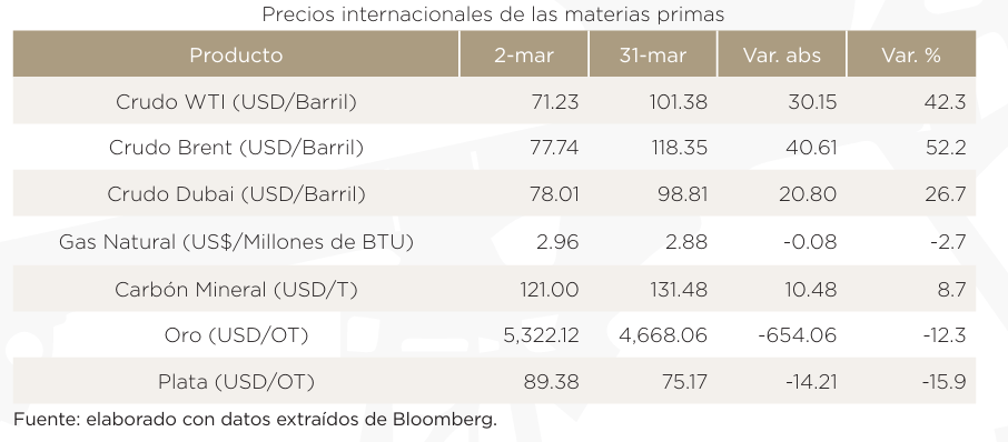 Los precios del crudo experimentaron aumentos significativos: el Brent subió un 52.2 % y el West Texas Intermediate (WTI) un 42.3 %, impulsados por la escalada del conflicto entre Estados Unidos, Irán e Israel, que provocó disrupciones en la oferta global de petróleo. Este encarecimiento energético tiene efectos en cadena sobre transporte, producción y precios al consumidor.