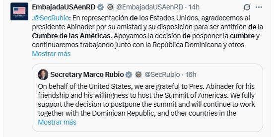 “En nombre de Estados Unidos, estamos agradecidos al presidente Abinader por su amistad y su disposición para albergar la Cumbre de las Américas”, declaró el funcionario estadounidense por medio de un comunicado publicado en X.