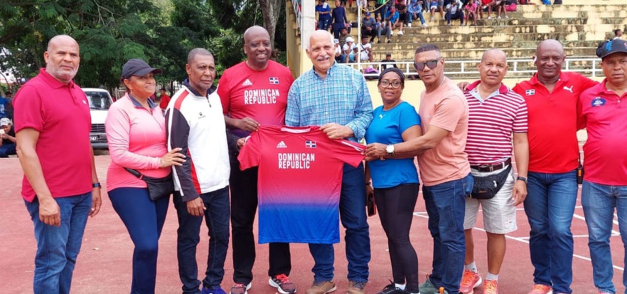 El doctor Jaime David Fernández Mirabal recibe una camiseta del evento de parte de los miembros del Comité Ejecutivo de la Federación Dominicana de Atletismo, encabezados por su presidente, Gerardo Suero Correa.