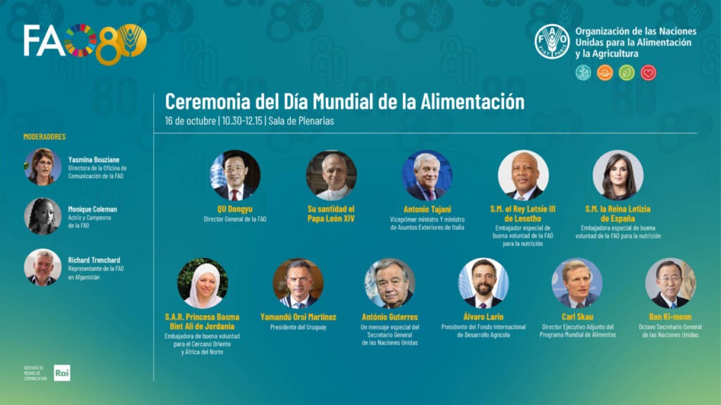 La Organización de las Naciones Unidas para la Alimentación y la Agricultura (FAO) conmemora este 16 de octubre el Día Mundial de la Alimentación 2025, una fecha que coincide con el 80 aniversario de su fundación, y que este año se celebra bajo el lema “De la mano por unos alimentos y un futuro mejores”.