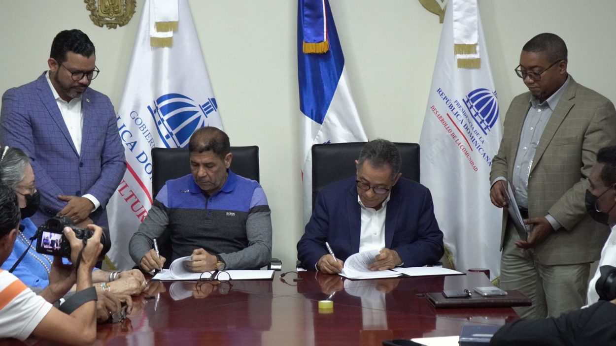 El ministro de Agricultura, Limber Cruz, y el director de la Dirección General de Desarrollo de la Comunidad (DGDC), Eléxido Paula, en el momento que firman el acuerdo interinstitucional.