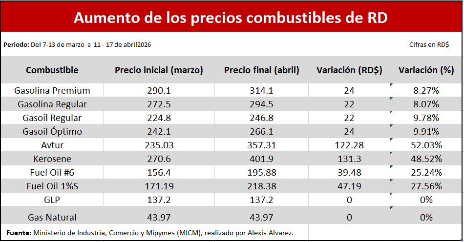 Los precios de los combustibles en República Dominicana acumulan incrementos entre RD$24 y RD$131.2 por galón en poco más de un mes, de acuerdo a los informes semanales del Ministerio de Industria, Comercio y Mipymes (MICM), impulsado por la crisis energética internacional derivada de la escalada militar en Medio Oriente.