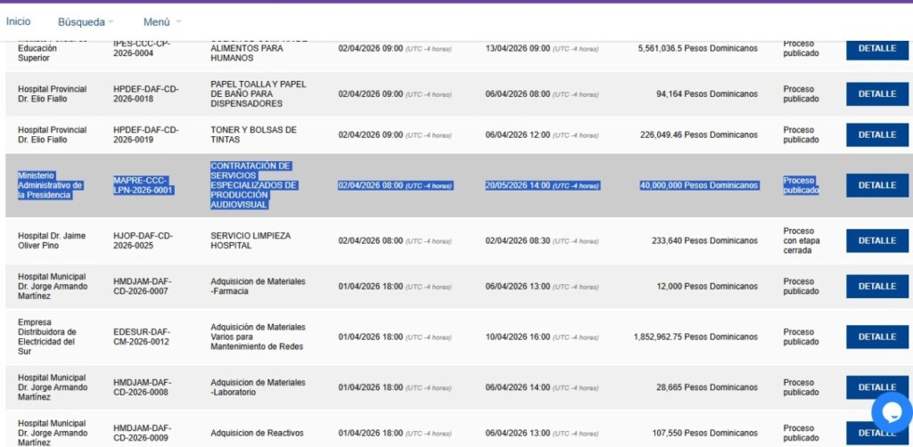 Mediante la Licitación Pública Nacional MAPRE-CCC-LPN-2026-0001, con fecha de hoy Jueves Santo, a las 8:00 de la mañana, el referido Ministerio justifica el proceso señalando que éste busca garantizar el soporte técnico necesario para los eventos oficiales de la Presidencia y Vicepresidencia de la República, así como de sus dependencias.