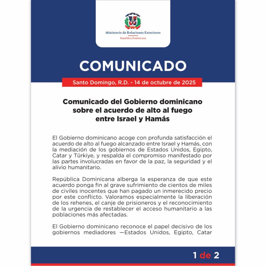 SANTO DOMINGO. – El Gobierno de la República Dominicana manifestó este martes su respaldo y satisfacción por el acuerdo de alto al fuego alcanzado entre Israel y Hamás, logrado con la mediación de Estados Unidos, Egipto, Catar y Türkiye.