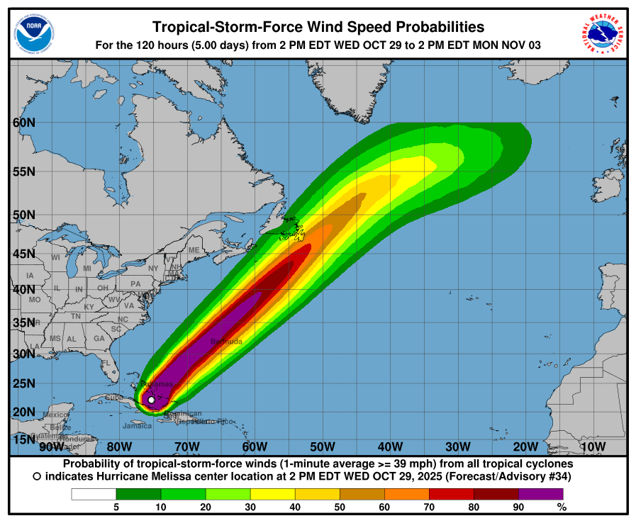 Melisa se localizaba cerca de las Bahamas a las 6:00 de la tarde del miércoles, luego de dejar fuertes lluvias y daños en República Dominicana, devastar a Jamaica y causar graves daños en el este de Cuba.