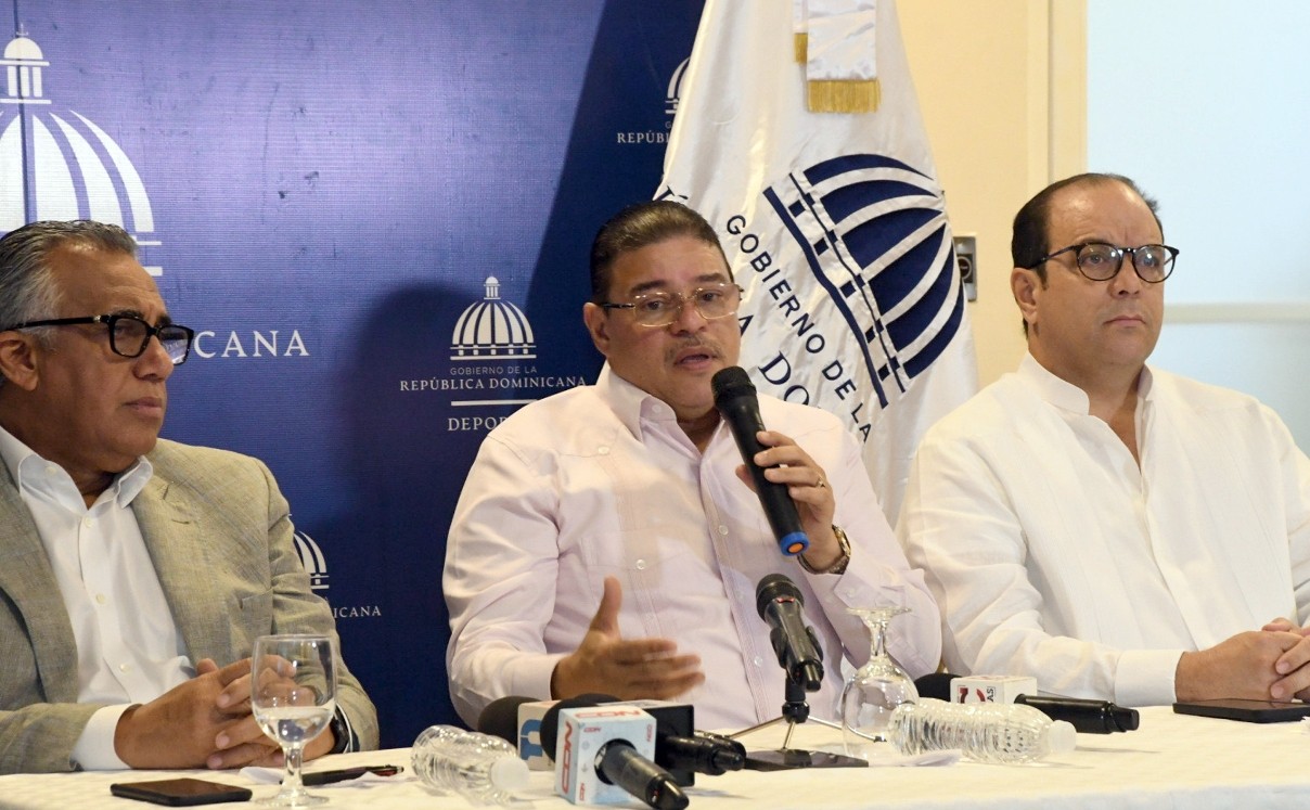Francisco Camacho, ministro de Deportes, ofrece detalles de las asambleas del CADE y del CID. Figuran, el presidente de Centro Caribe Sports, Luis Mejía, y el viceministro Administrativo de Deportes, Franklin De la Mota.