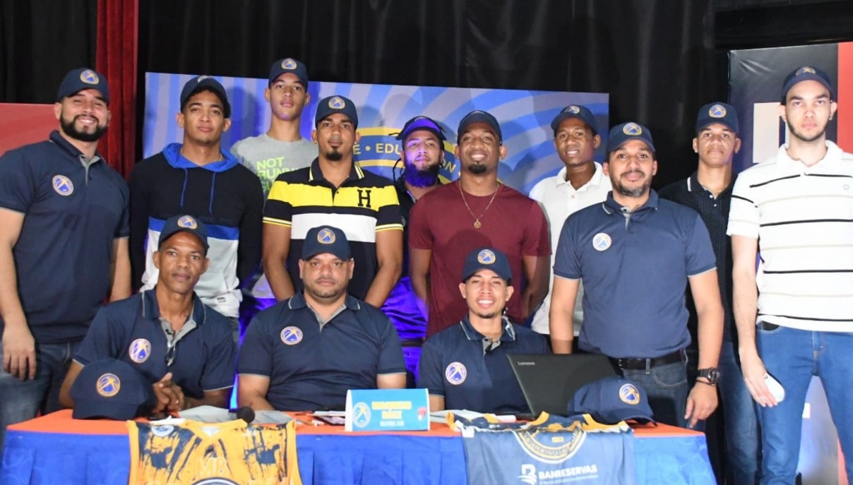 Rafael Cordero Haché, presidente de los Guerreros de Santo Domingo Este, junto al dirigente, gerente y parte de los jugadores seleccionados.
