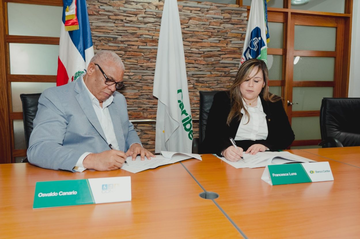 Firman el acuerdo, Osvaldo Canario, director ejecutivo del Conadis y Francesca Luna, directora senior de talento y cultura de Banco Caribe.