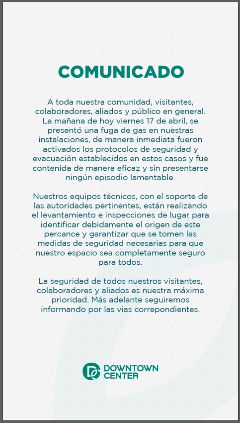Este viernes 17 de abril, se presentó una fuga de gas en las instalaciones del centro comercial Down Town, generando la activación de inmediata de los protocolos internos de seguridad establecidos para este tipo de situaciones.