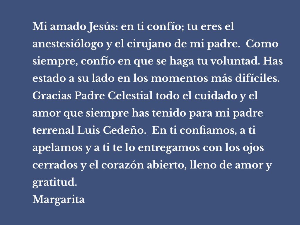 Asimismo Margarita pidió a todos sus seguidores acompañarlos en oración para que Dios le dé la fortaleza necesaria a su padre de superar la cirugía .