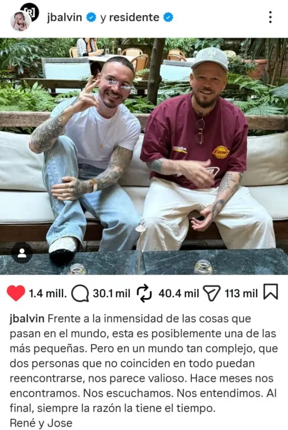 Lejos de tratarse de un gesto impulsivo, J Balvin y René Pérez (Residente) revelaron que este acercamiento fue el resultado de un encuentro privado ocurrido meses atrás, donde pudieron escucharse, intercambiar puntos de vista y encontrar puntos de entendimiento.