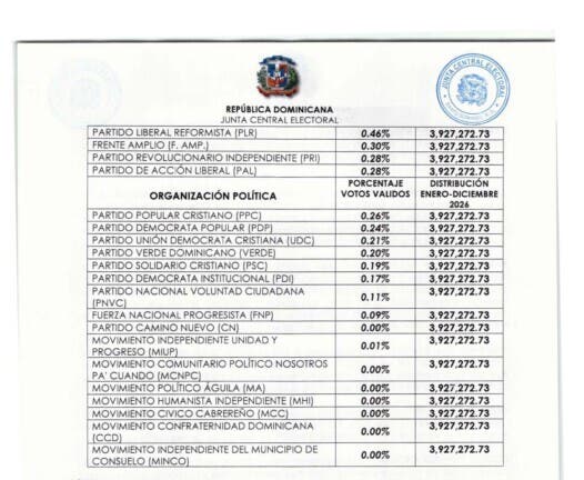 Encabeza la asignación el Partido Revolucionario Moderno (PRM), que con el 46.47 % de los votos válidos recibirá RD$432 millones durante el período enero-diciembre de 2026.