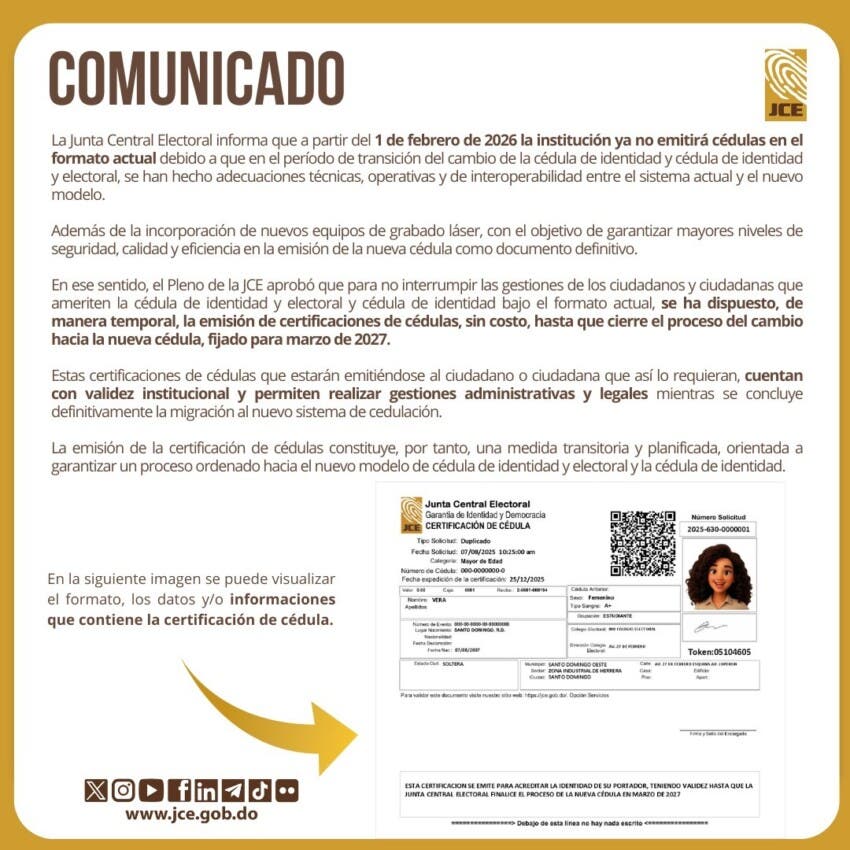 La JCE explicó que estas certificaciones contarán con validez institucional y permitirán a los ciudadanos realizar trámites oficiales mientras concluye el proceso de migración hacia el nuevo documentod e identidad, cuyo cierre está previsto para marzo de 2027.