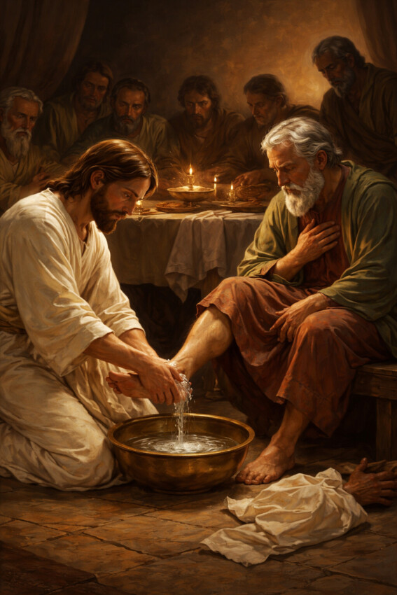 Las escrituras dicen que Jesús, sabiendo que el Padre había puesto todas las cosas en sus manos, y que de Dios había salido y a Dios volvía, se levantó de la cena y se quitó el manto, y tomando una toalla, se la ciñó.
