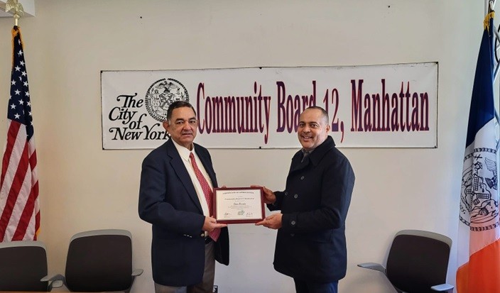 NUEVA YORK. La Junta Comunal 12 en el Alto Manhattan reconoció recientemente al periodista Ramón Mercedes, quien escribe y reporta para varios medios (TV, Radio y Periódicos) en la República Dominicana.