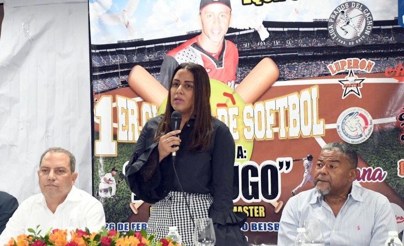 Sulky Caro, viuda Lugo, habla junto a Gary Bautista, presidente de la Federación de Softbol e Ignacio Capellán.
