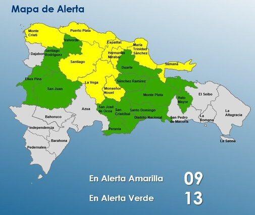 El COE mantiene 9 provincias en alerta amarilla y 13 en alerta verde, ante la persistencia de condiciones inestables que podrían generar nuevos aguaceros, tormentas eléctricas y ráfagas de viento durante la tarde y la noche.