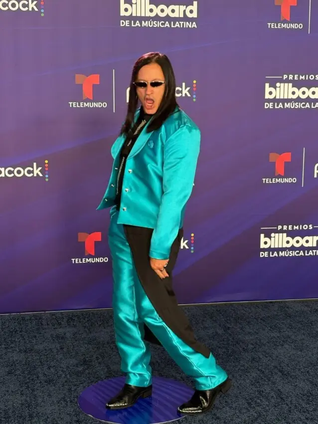 Peso Pluma, uno de los más nominados y quien fue distinguido con el Premio Vanguardia, llegó vestido de esmoquin, con la camisa abierta y un lazo desamarrado. En su brazo estaba su pareja y también artista Kenia OS, quien llevaba un ‘body’ de pedrería y una falda de red negros, al que le dio color con una boa azul rey.