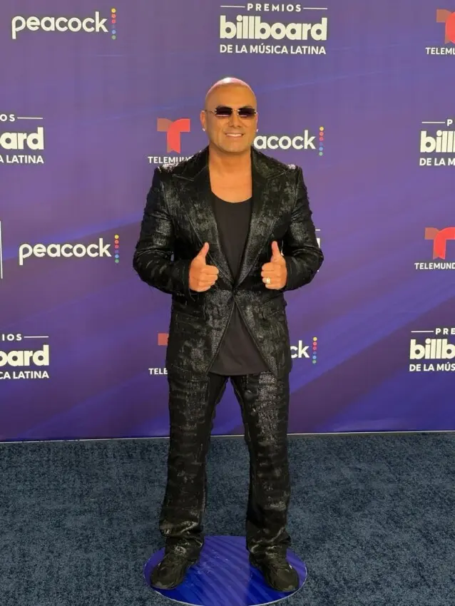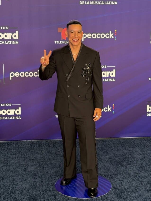 También de negro y elegante apareció Daddy Yankee, con un traje de chaqueta y pantalón con terminaciones de canutillos negros y una hermosa flor bordada con aplicaciones en el bolsillo.