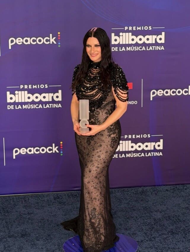 Laura Pausini, quien recibe el premio Ícono, escogió un traje negro de encaje hasta el suelo, sobre el que llevaba un top de pedrería negra que fungía como la principal pieza de joyería.