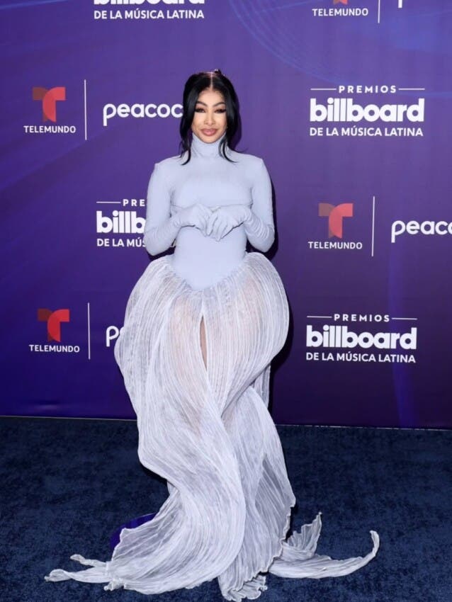Yailín «La más viral» fue de las pocas que intentaron jugar con conceptos de moda diferentes con un traje azul gris, de manga larga, cuello tortuga y top, y una falda que parecía la capa de una cebolla.