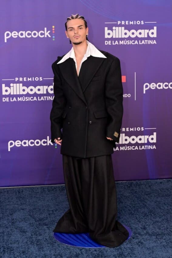 El cantautor español Abraham Mateo logró combinar el riesgo con la elegancia clásica con un traje negro de gran tamaño sobre una camisa blanca, en un conjunto de estilo maximalista que destacó por el cuello amplio, los pantalones anchos y las chaquetas de proporciones exageradas, acorde con las tendencias actuales.