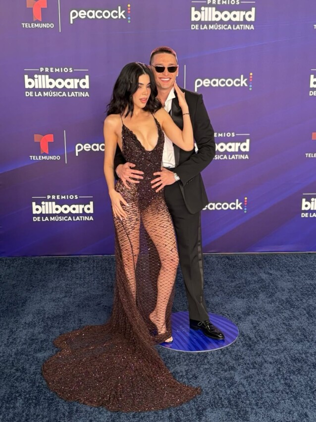 Peso Pluma, uno de los más nominados y quien fue distinguido con el Premio Vanguardia, llegó vestido de esmoquin, con la camisa abierta y un lazo desamarrado. En su brazo estaba su pareja y también artista Kenia OS, quien llevaba un ‘body’ de pedrería y una falda de red negros, al que le dio color con una boa azul rey.