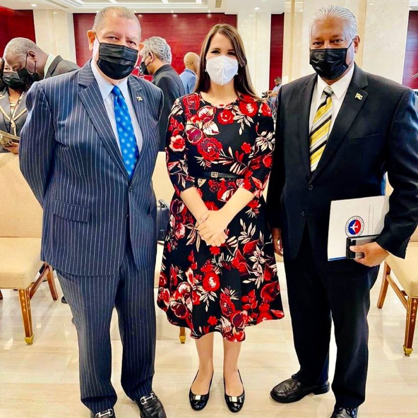 De izquierda a derecha: el Ministro de Transporte y Minas, Senador Audley Shaw, la Embajadora dominicana en Jamaica, Angie Martínez y el Director General de la Autoridad de Aviación Civil de Jamaica, Nari Williams-Singh.