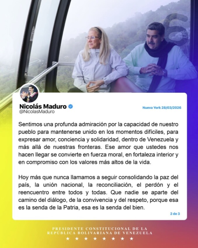 «Que Venezuela sea casa de oración, casa de respeto, casa de encuentro. Que limpiemos el corazón del odio, de la división y del egoísmo, y abramos paso al perdón, a la reconciliación y a la paz», pidieron Maduro y Flores en la misiva, publicada en la cuenta de Instagram del hijo del mandatario, el diputado Nicolás Maduro Guerra.