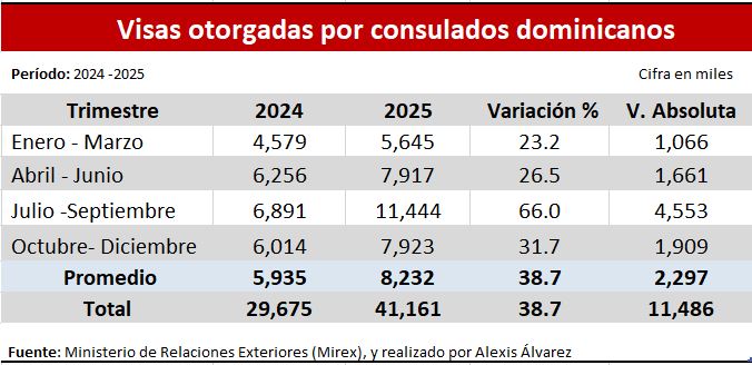 Las estadísticas señalan que, de manera trimestral, los consulados dominicanos emitieron en promedio 8,232 visas en 2025 frente a las 5,935 en 2024, consolidando una expansión interanual del 38.7%. Esto evidencia no solo un aumento en la movilidad y solicitudes, sino también un flujo mayor de ingresos derivados de los servicios consulares.